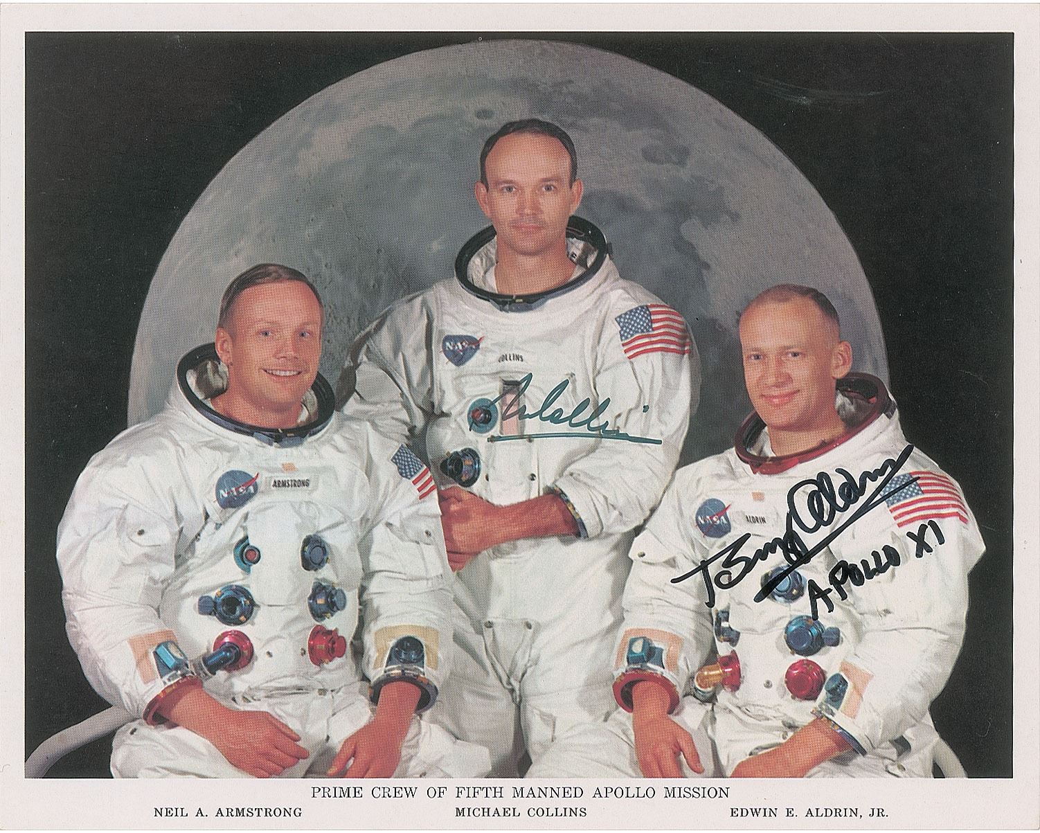Official color 10 x 8 NASA lithograph of the Apollo 11 crew posing in their white space suits against a lunar background, signed in black felt tip, "M. Collins" and "Buzz Aldrin, Apollo XI." In fine condition, with scattered light creasing. Consignor notes that the Aldrin signature was obtained at a UACC annual convention held in Los Angeles on September 4–5, 2004.