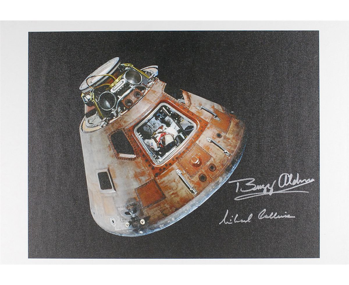 Color giclee print on canvas, 24 x 17, of an image of an astronaut sitting in a Command Module, as seen from the outside of the capsule, signed in silver ink by Buzz Aldrin and Michael Collins. In fine condition. Rolled.