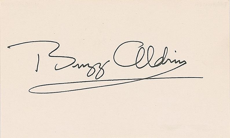 Pair of black ink signatures, “Buzz Aldrin” and “M. Collins,” on individual off-white 5 x 3 cards. In overall fine condition, with a JSA label affixed to the reverse of the Aldrin.