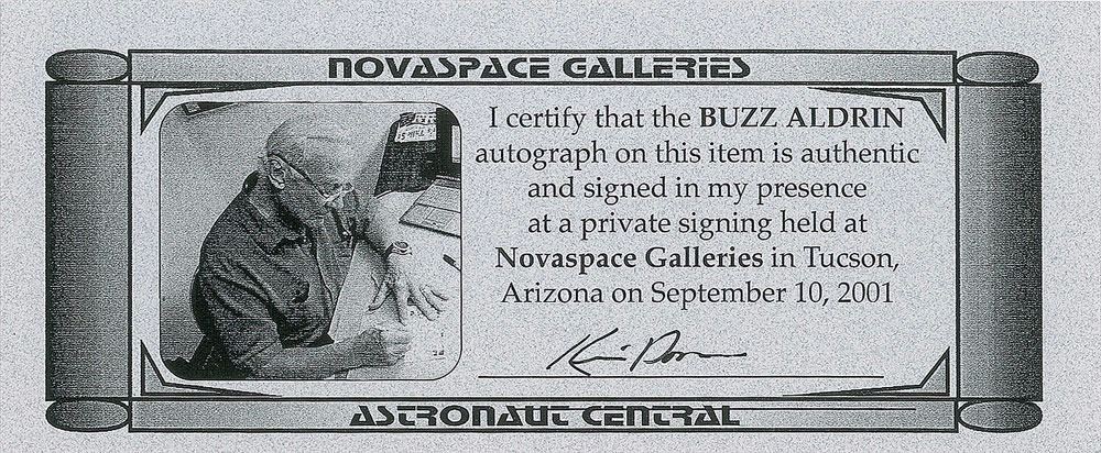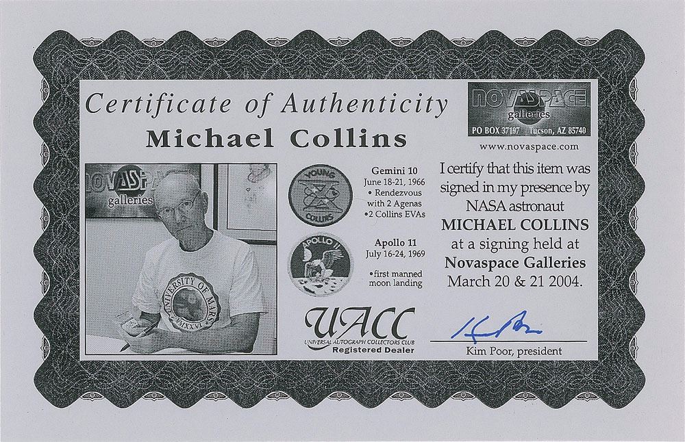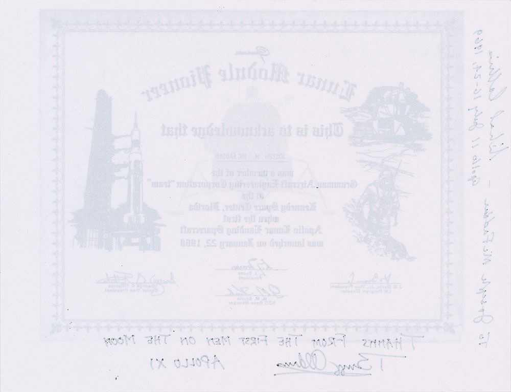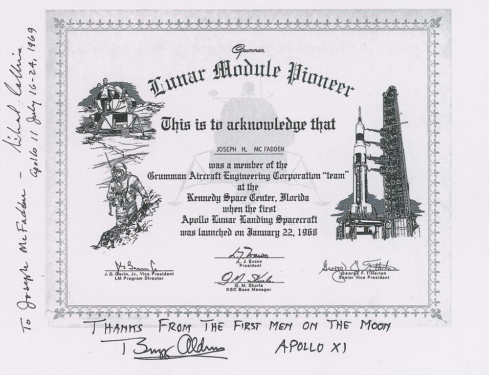 Photocopy of a certificate issued to Joseph H. McFadden, a member of the Grumman Aircraft Engineering Corporation team that developed the Apollo Lunar Module, one page, 11 x 8.5, authentically signed and inscribed in the borders in black felt tip, "To Joseph McFadden, Michael Collins, Apollo 11, July 16–24, 1969" and "Thanks from the first men on the moon, Buzz Aldrin, Apollo XI." In very fine condition. Accompanied by certificates of authenticity from Novaspace for both signatures.