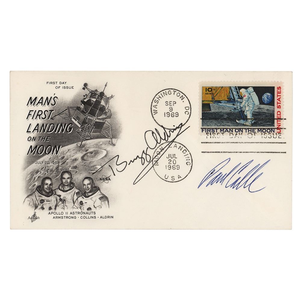 Choice FDC featuring Calle's 'First Man on the Moon' stamp with a cachet honoring the Apollo 11 lunar landing, signed in black felt tip by an Apollo 11 moonwalker, "Buzz Aldrin," and in blue ballpoint by the stamp's artist, "Paul Calle." In very fine condition.