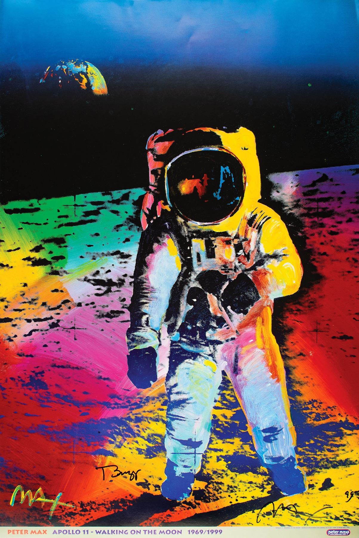 Color 24 x 36 print of Peter Max's colorful pop art rendition of the famous 'visor shot' of Buzz Aldrin during man's first moonwalk, entitled 'Apollo 11 - Walking on the Moon, 1969/1999,' signed in black felt tip by the subject, "Buzz," and the artist, "Max, 99." In fine condition. Originally from Aldrin's personal collection, the print is accompanied by a letter of provenance from his stepdaughter Lisa Cannon, and a full letter of authenticity from JSA.