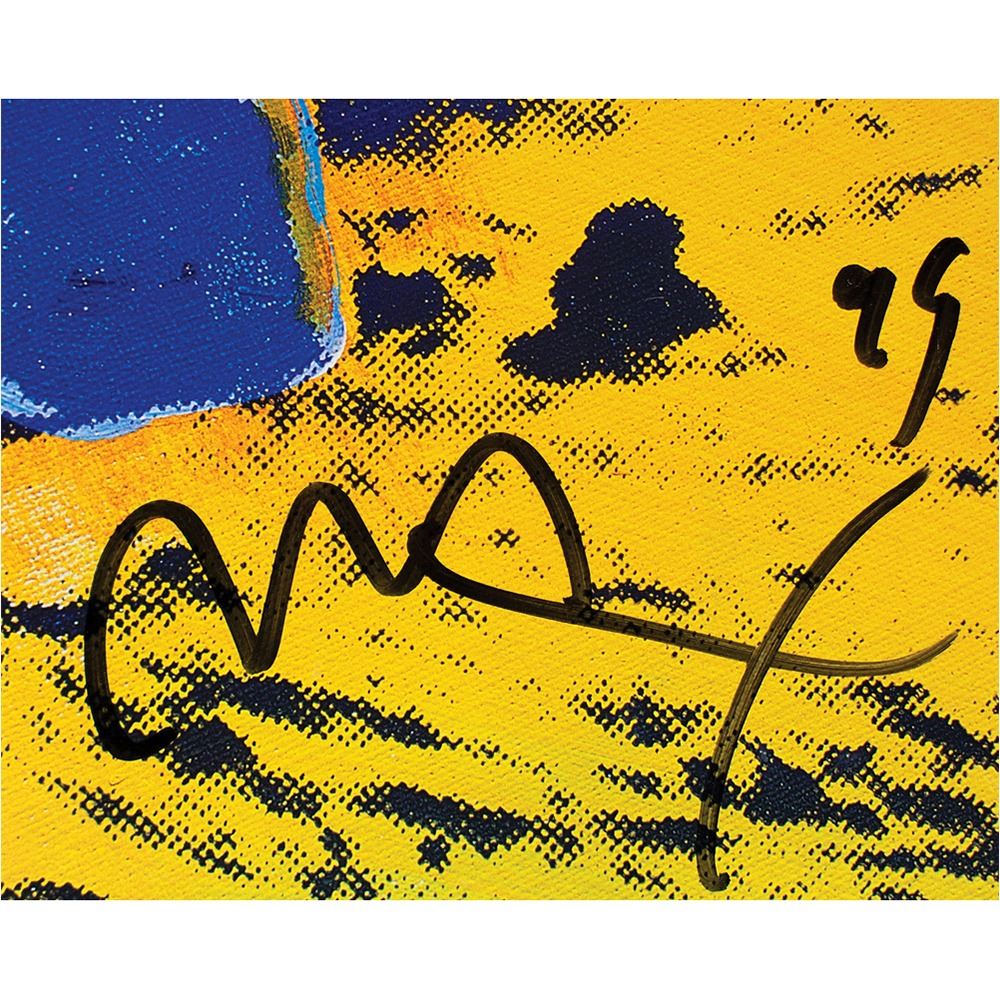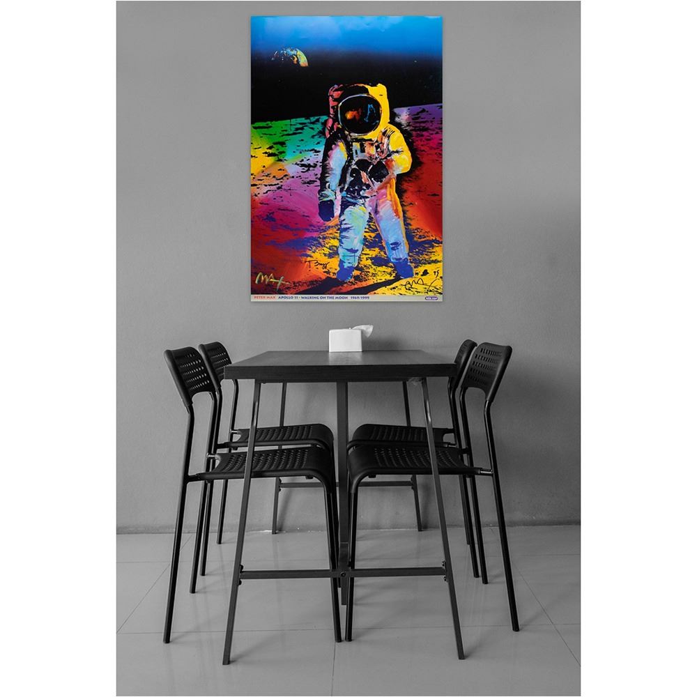 Color 24 x 36 print of Peter Max's colorful pop art rendition of the famous 'visor shot' of Buzz Aldrin during man's first moonwalk, entitled 'Apollo 11 - Walking on the Moon, 1969/1999,' signed in black felt tip by the subject, "Buzz," and the artist, "Max, 99." In fine condition, with a crease to the upper left corner tip, and some light surface creases to the upper background area. Originally from Aldrin's personal collection, the print is accompanied by a letter of provenance from his stepdaughter Lisa Cannon, and a full letter of authenticity from JSA.