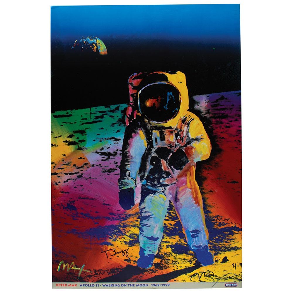 Color 24 x 36 print of Peter Max's colorful pop art rendition of the famous 'visor shot' of Buzz Aldrin during man's first moonwalk, entitled 'Apollo 11 - Walking on the Moon, 1969/1999,' signed in black felt tip by the subject, "Buzz," and the artist, "Max, 99." In fine condition, with a crease to the upper left corner tip, and some light surface creases to the upper background area. Originally from Aldrin's personal collection, the print is accompanied by a letter of provenance from his stepdaughter Lisa Cannon, and a full letter of authenticity from JSA.