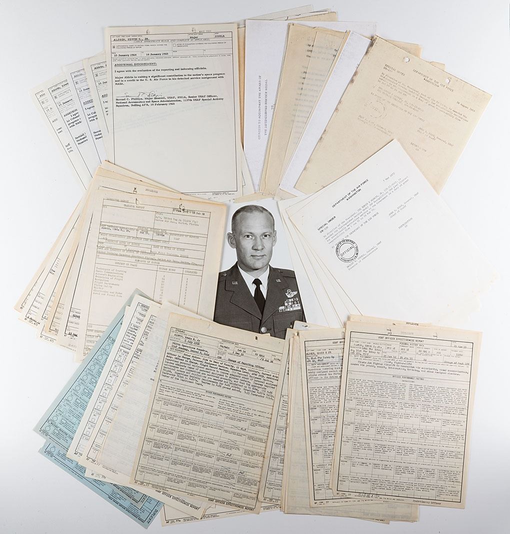 Incredible collection of military records belonging to Apollo 11 moonwalker Buzz Aldrin, dating from his first year in the United States Air Force (USAF) in 1951 until his retirement from the National Aeronautics and Space Administration (NASA) in 1971. The archive consists of Officer Effectiveness Reports, Training Reports, supplementary endorsements, and facsimiles of citations and letters, all of which are housed in Aldrin’s original “United States Air Force, Officer Command Selection Record Group” folder, with tab labeled “Aldrin, Edwin E. Jr.,” signed on the front cover in black felt tip, “My Official Military Records and Evaluations during the time I was assigned to NASA Duties thru June 1971, Buzz Aldrin.”