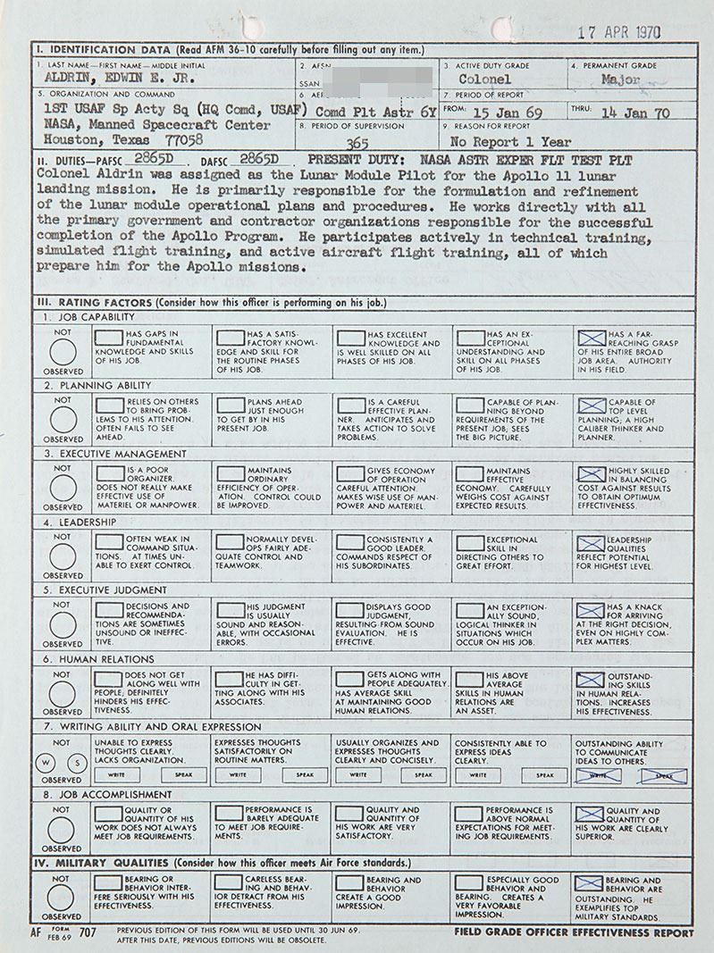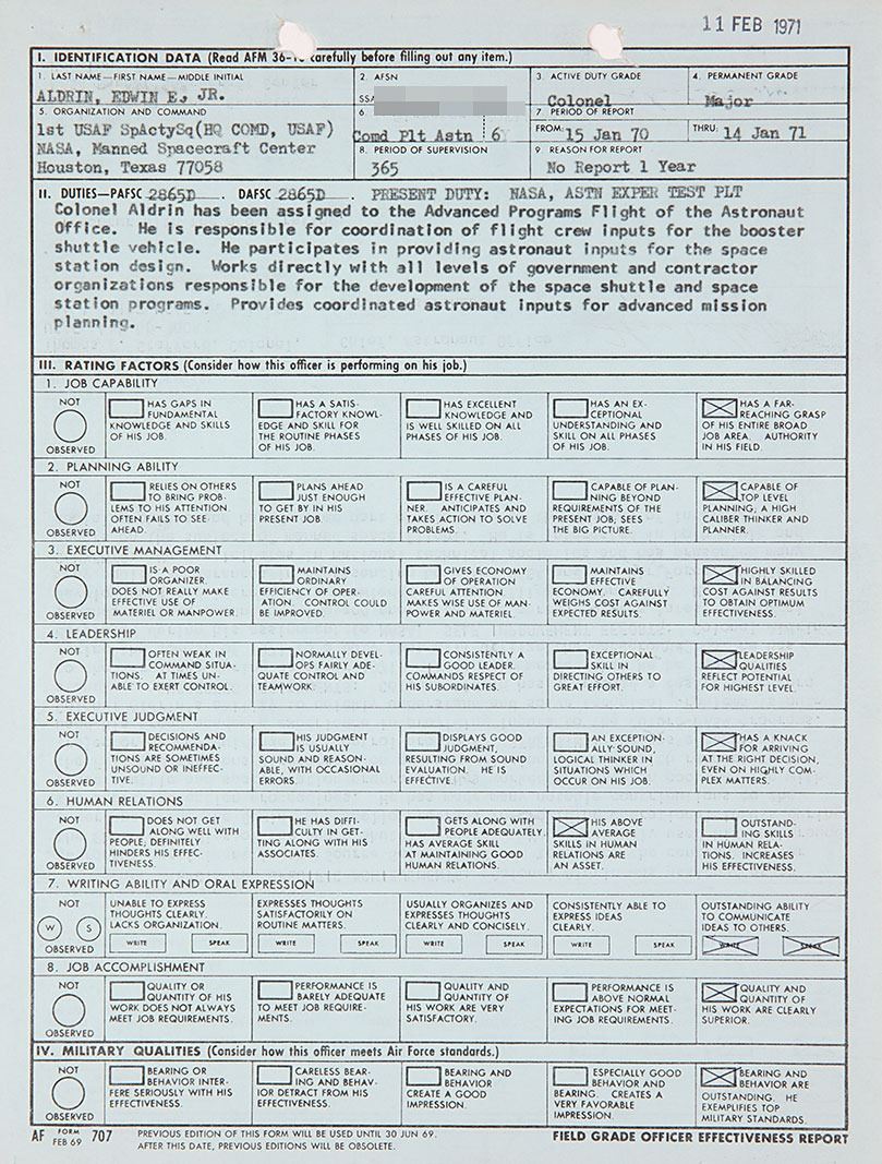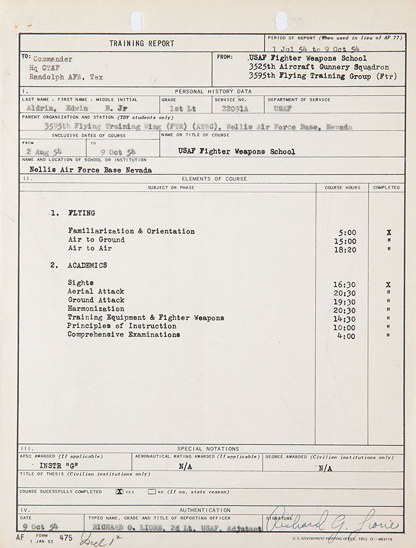 The collection includes 13 of Aldrin’s Officer Effectiveness Reports (OER), dating between April 15, 1953, and February 11, 1971, each issued for “Aldrin, Edwin, E. Jr.” The reports follow Aldrin’s meteoric rise through the military, and accordingly list his ranks as such: Second Lieutenant in the 16th Fighter Interceptor Squadron, 51st Fighter Interceptor Wing during the Korean War; First Lieutenant as an aerial gunnery instructor at Nellis Air Force Base in Nevada; Captain at the USAF Academy in Colorado; Captain/Wing Commander in the 22nd Fighter Day Squadron (Tactical Fighter), 36th Fighter Day Wing; Major at the Air Force Systems Command (AFSC), shortly after earning a Sc.D. degree in astronautics, and then as one of 14 members of NASA Astronaut Group 3, which selected Aldrin as an astronaut for the Gemini Program; and Major in the 1st USAF Space Activity Squadron with NASA.