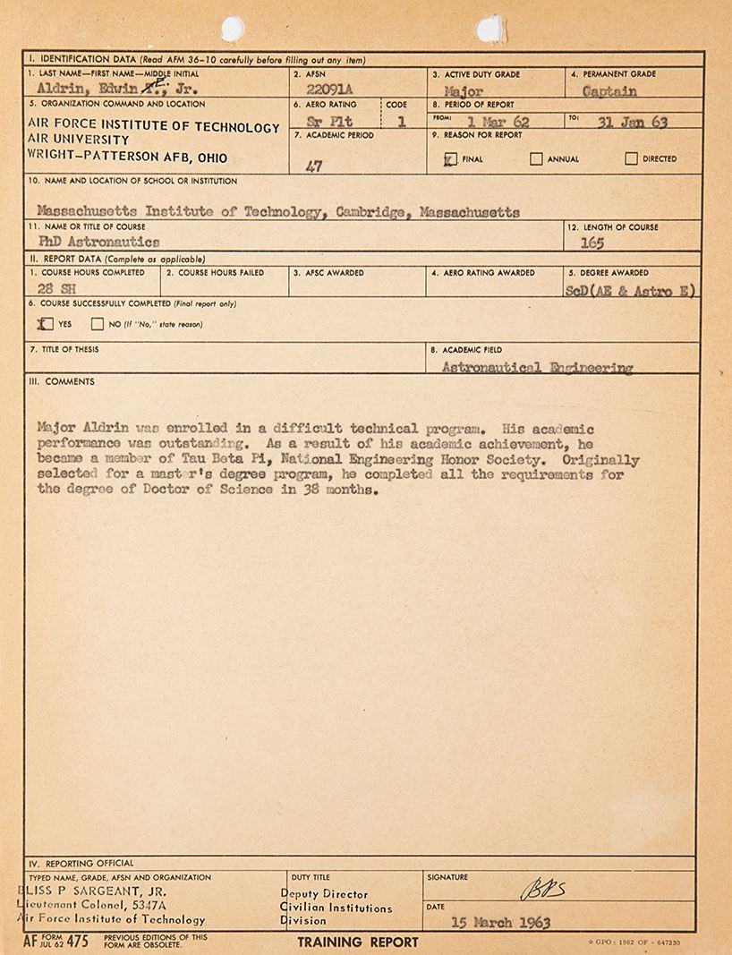 Also included are eight USAF Training Reports for Aldrin, dated between June 1, 1951 and January 31, 1963, and listing ‘School and Institution’ locations like “3303rd Training Squadron” in Bartow, Florida, “Advanced Pilot Training” in Bryan, Texas, “USAF Fighter Weapons School” at Nellis Air Force Base in Nevada, and “PhD Astronautics” at Massachusetts Institute of Technology in Cambridge, Mass, with the comment section to the final M.I.T. report reading: “Major Aldrin was enrolled in a difficult technical program. His academic performance was outstanding. As a result of his academic achievement, he became a member of Tau Beta Pi, National Engineering Honor Society. Originally selected for a master’s degree program, he completed all the requirements for the degree of Doctor of Science in 38 months.”