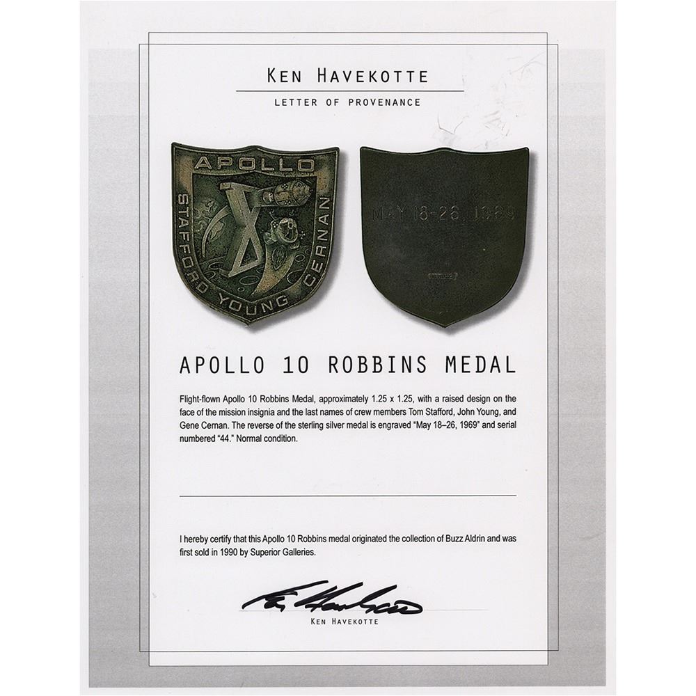 Buzz Aldrin's sterling silver Apollo 10 Robbins medallion, measuring approximately 1.25è x 1.25è, featuring a raised design of the shield-shaped mission insignia on the face‰ÛÓa Roman numeral "X" towering over the lunar surface, with the CM and LM on orbit, with the crew's surnames in the border: "Stafford, Young, Cernan." The reverse is engraved with the mission dates, "May 18‰ÛÒ26, 1969," and serial number, "44." Stamped below with the Robbins "Sterling" hallmark. Condition is mint state. Accompanied by the original case and a letter of provenance from aerospace memorabilia specialist Ken Havekotte, certifying that the medal "originated from the collection of Buzz Aldrin and was first sold in 1990 by Superior Galleries."