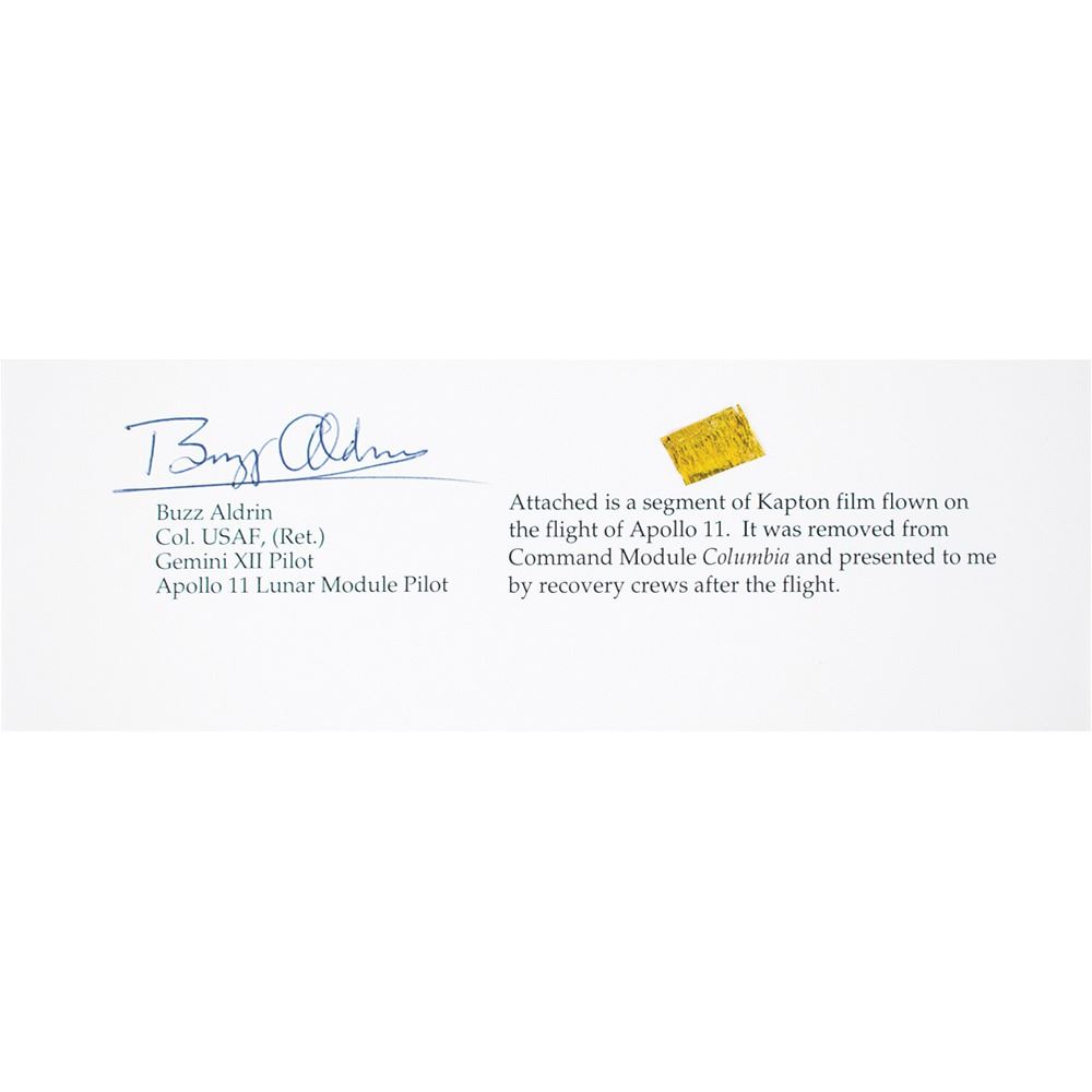 Small swatch of flown Kapton foil removed from the Apollo 11 CM 'Columbia,' measuring approximately .75è x .5è, affixed to an 8è x 3è sheet with a typed certification statement signed in blue ballpoint by the Apollo 11 LMP, "Buzz Aldrin." In full: "Attached is a segment of Kapton film flown on the flight of Apollo 11. It was removed from Command Module Columbia and presented to me by recovery crews after the flight." In fine condition. The Apollo 11 Command Module's Kapton foil experienced the searing heat of re-entry into Earth's atmosphere on July 24, 1969, and much of it burned off; what little remained has long since been prized as a flight-flown souvenir.