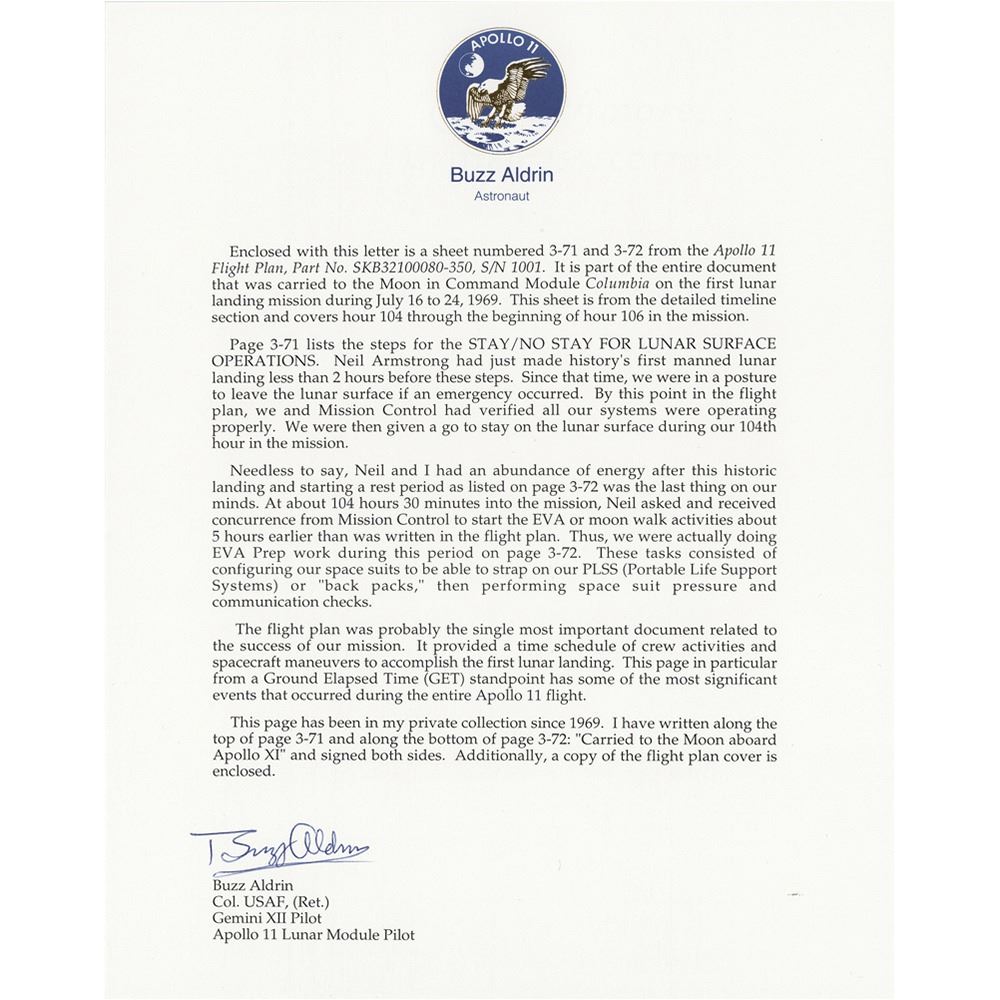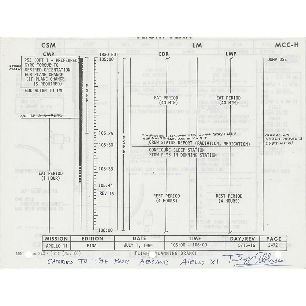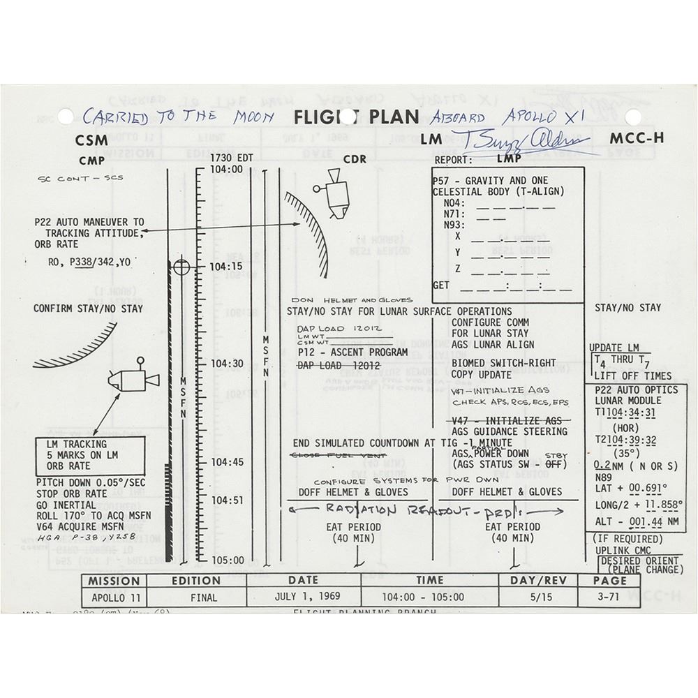 Extraordinary flown 10.5 x 8 double-sided page from the final Apollo 11 Flight Plan carried into lunar orbit aboard the Command Module 'Columbia' during the first lunar landing mission, signed and flight-certified on both sides in blue ballpoint, ‰ÛÏCarried to the moon aboard Apollo XI, Buzz Aldrin.‰Û The page‰Ûªs front and back, numbered ‰ÛÏ3‰ÛÒ71‰Û and ‰ÛÏ3-72,‰Û provide a detailed timeline of activities beginning 75 minutes after their historic landing‰ÛÓnamely, the steps for "Stay/No Stay for Lunar Surface Operations." Notably, there are some hand-notated amendments to the plan, including "Don Helmet and Gloves" under the "CDR" column at 104:20. This is only one of eleven sheets in the flight plan to detail the lunar surface activities for Apollo 11. In fine condition.