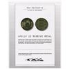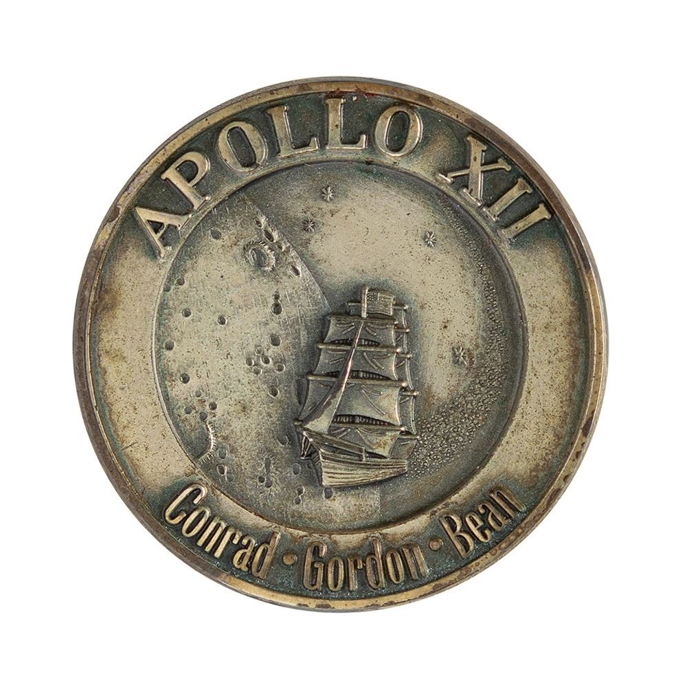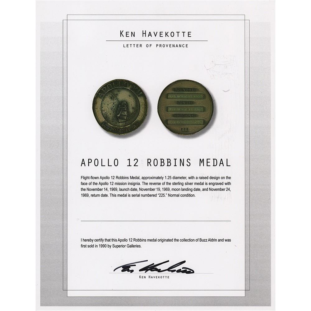 Buzz Aldrin‰Ûªs sterling silver Apollo 12 Robbins medallion, approximately 1.25è in diameter, with a raised design of the Apollo 12 mission insignia on the face‰ÛÓa 'Yankee Clipper' ship sailing over the moon's 'Ocean of Storms,' the location of the Apollo 12 landing site. The reverse is engraved with the launch date of November 14, 1969; moon landing date of November 19, 1969; and return date of November 24, 1969. The medal is serial numbered "225" and stamped below with the Robbins "Sterling" hallmark. Condition is mint state, with light tarnishing. Accompanied by the original case (which has a cracked lid) and a letter of provenance from aerospace memorabilia specialist Ken Havekotte, who attests to the medallion's flown status and certifies that the medal "originated from the collection of Buzz Aldrin and was first sold in 1990 by Superior Galleries."