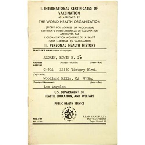 <B>Buzz Aldrin's Personal Vaccination Record During His Years at NASA and Beyond.</B></I> Titled "International Certificates of Vaccination", 3.75" x 6", 15 pages, yellow wrappers, United States Government Printing Office. Signed three times in full, "<I>Edwin E. Aldrin Jr.</B></I>". Here is the official record of Buzz Aldrin's various vaccinations, most received while he was part of the Apollo space program. The first vaccination he received was in May of 1964 for yellow fever. Interestingly, three of his vaccinations occurred in the month before the historic Apollo 11 flight. He was vaccinated for smallpox, typhoid, and polio shortly before the historic Apollo 11 mission and was vaccinated for cholera just two months after his return from the moon. A truly one-of-a-kind piece of Buzz Aldrin's personal effects. <I>From the personal collection of Dr. Buzz Aldrin and accompanied by a signed Letter of Authenticity from him.</B></I><BR><BR><b>Shipping:</b> Flat Material, Small (<a target="_blank" href="http://www.heritageauctions.com/common/shipping.php">view shipping information</a>)