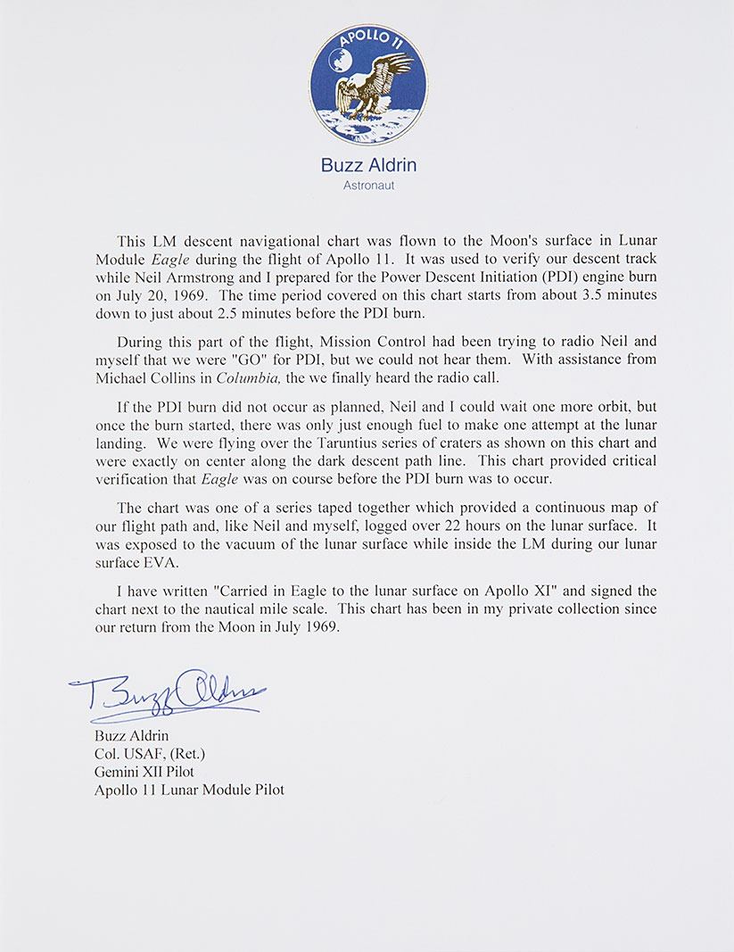 Accompanied by a detailed letter of provenance signed by Buzz Aldrin, in full: "This LM descent navigational chart was flown to the Moon's surface in Lunar Module Eagle during the flight of Apollo 11. It was used to verify our descent track while Neil Armstrong and I prepared for the Power Descent Initiation (PDI) engine burn on July 20, 1969. The time period covered on this chart starts from about 3.5 minutes down to just about 2.5 minutes before the PDI burn. During that part of the flight, Mission Control has been trying to radio Neil and myself that we were 'GO' for PDI, but we could not hear them. With assistance from Michael Collins in Columbia, we finally heard the radio call.