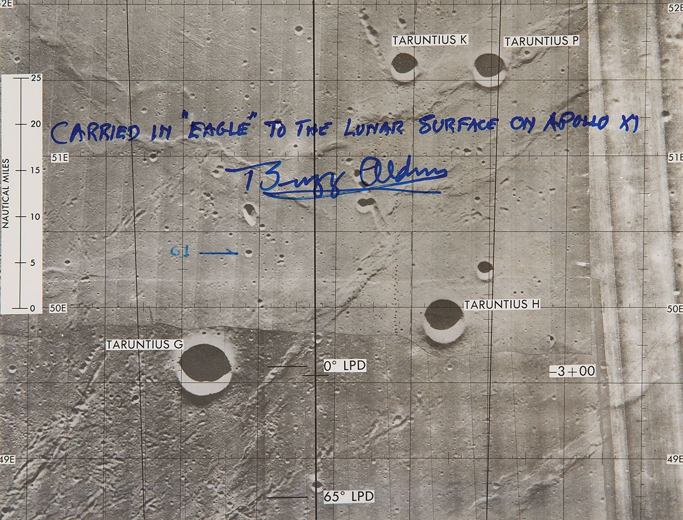 If the PDI burn did not occur as planned, Neil and I could wait one more orbit, but once the burn started, there was only just enough fuel to make one attempt at the lunar landing. We were flying over the Taruntius series of craters as shown on this chart and were exactly on center along the dark descent path line. This chart provided critical verification that Eagle was on course before the PDI burn was to occur. The chart was one of a series taped together which provided a continuous map of our flight path and, like Neil and myself, logged over 22 hours on the lunar surface. It was exposed to the vacuum of the lunar surface while inside the LM during our lunar surface EVA. I have written 'Carried in Eagle to the lunar surface on Apollo XI' and signed the chart next to the nautical mile scale. This chart has been in my private collection since our return from the Moon in July 1969." Also accompanied by a photo of the Apollo 11 Command Module over this lunar region, as well as a photo of the consignor meeting Buzz Aldrin in 2006; at that time, Aldrin said he did not remember the significance of the "G1" annotation on the chart.