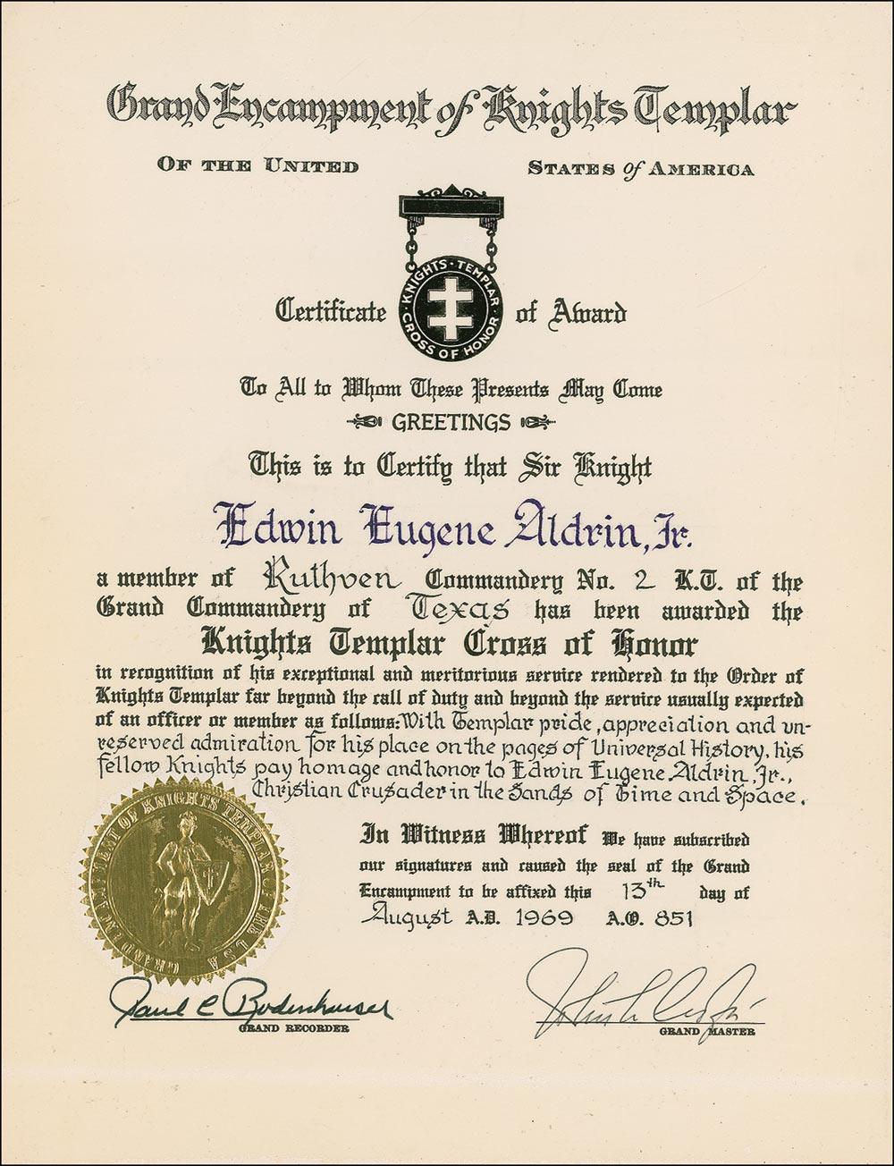 Unsigned award certificate, 8.5 x 11, dated August 13, 1969. A certificate presented to Aldrin by the Knights Templar, awarding him the Cross of Honor “for his place on the pages of Universal history [and as a] Christian Crusader in the Sands of Time and Space”; and a 2007 TLS of provenance, signed “Buzz,” attesting that the award came from his personal collection. Certificate laminated, otherwise fine condition.