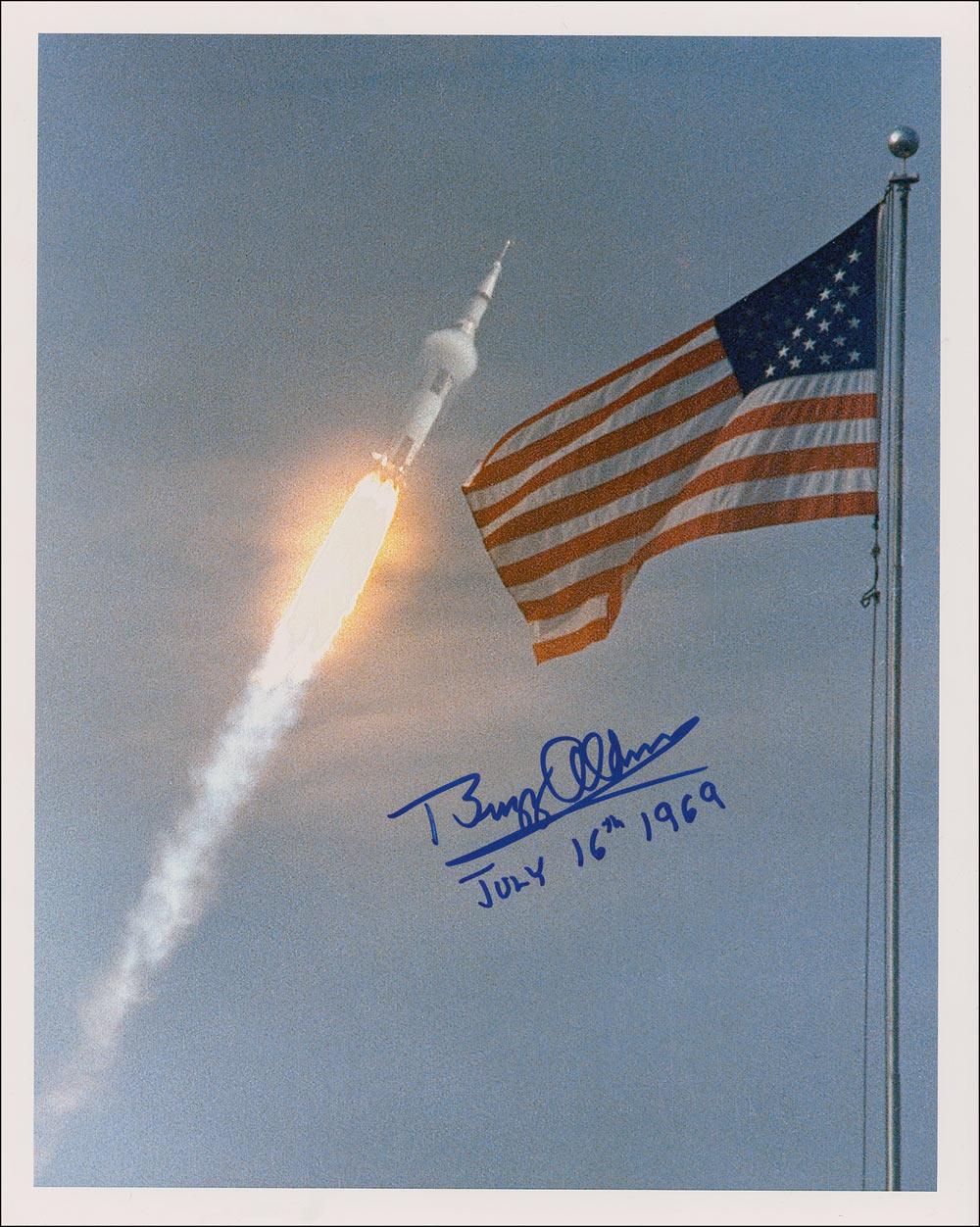 Breathtaking color glossy 12 x 15 photo of the Apollo 11 liftoff, signed in blue felt tip, “Buzz Aldrin, July 16, 1969.” In very fine condition.