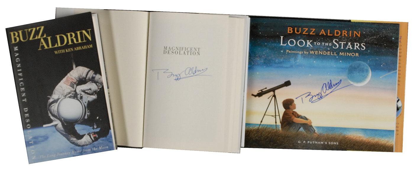 Three hardcover books: two copies of Magnificent Desolation, each signed in blue ink on the half-title page; and Look to the Stars, signed on the title page in blue felt tip. In fine condition.