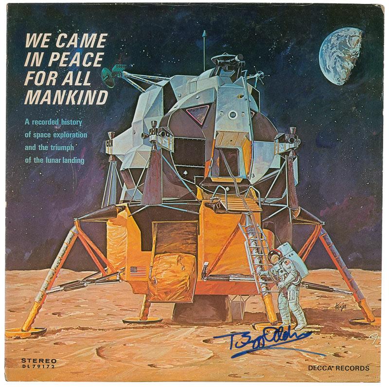 We Came in Peace for All Mankind album signed on the front cover in blue felt tip. Collector’s label affixed to back cover, and some scattered light creases and wrinkles, otherwise fine condition. The record is not included.