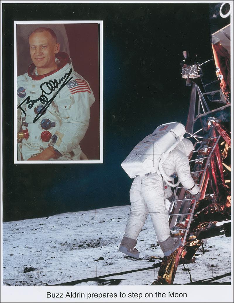 Color 3 x 5 glossy photo of Aldrin in his spacesuit, signed in black felt tip, “Buzz Aldrin.” Photo is affixed to an 8.5 x 11 color photo of Aldrin preparing to set foot on the moon. In very fine condition.