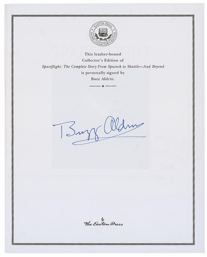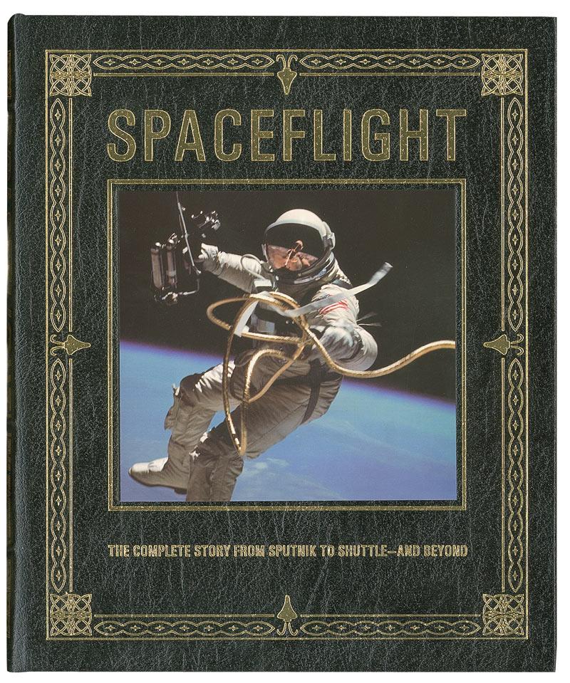 Signed book: Spaceflight: The Complete Story from Sputnik to Shuttle – and Beyond. ‘Collector’s edition.’ Norwalk, Connecticut: Easton Press, 2007. Leather-bound hardcover, 10 x 11.25, 320 pages. Boldly signed in blue felt tip on a specially printed prefatory page. In very fine condition.