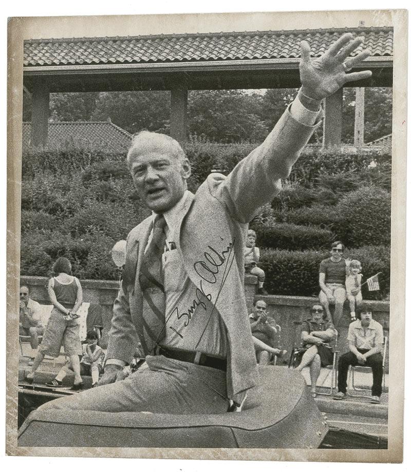 Candid 5.5 x 6.25 press photo of Aldrin waving from a convertible during a parade, signed in black ink. A diagonal crease to lower left corner, a few other creases, and some light diagonal lines from magnetic photo album, otherwise fine condition.