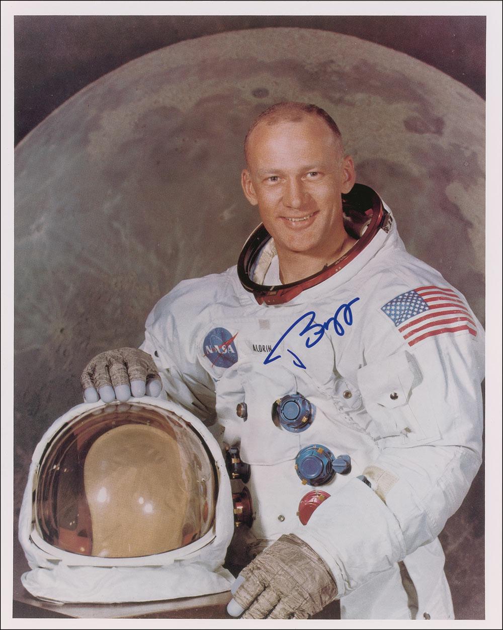 Color satin-finish 8 x 10 photo of Aldrin in his spacesuit before a lunar backdrop, signed in blue felt tip, “Buzz.” In very fine condition.