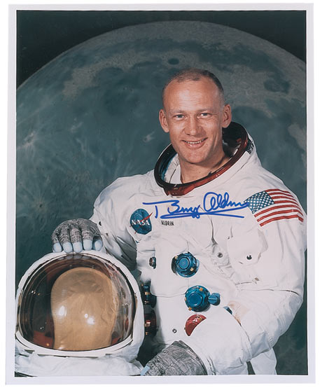 Color satin-finish 8 x 10 photo of Aldrin posing in his spacesuit against a lunar background, signed in blue felt tip. In very fine condition.