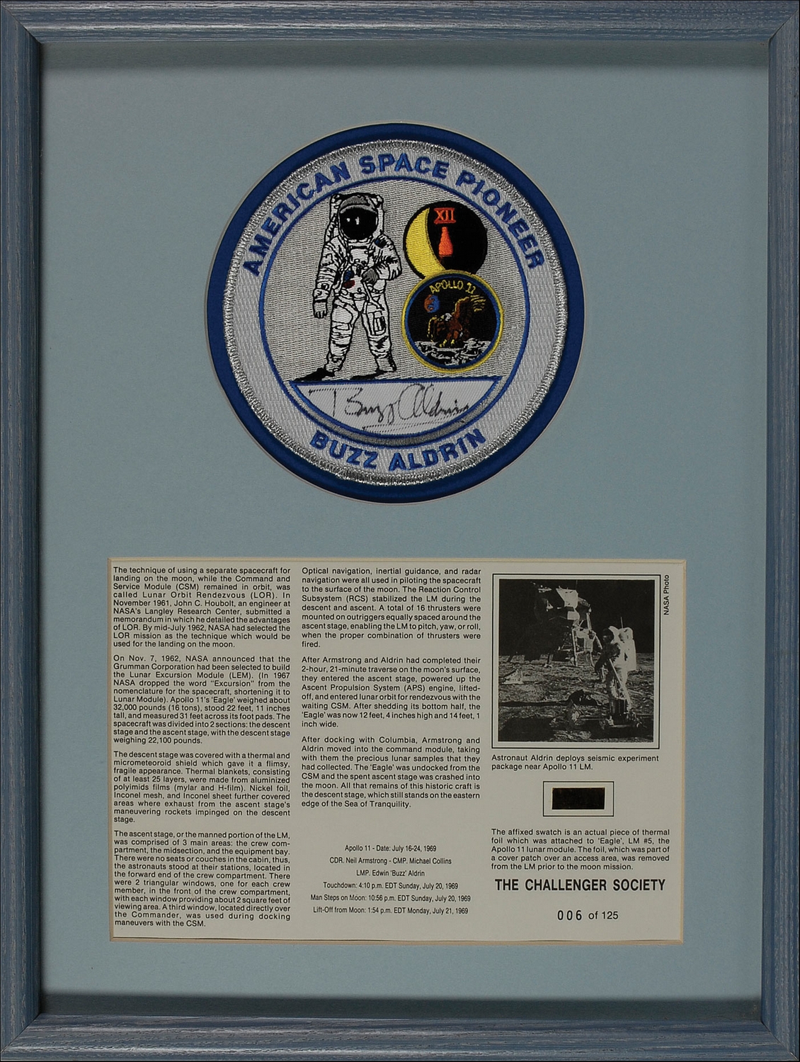 Embroidered commemorative “American Space Pioneer” patch, five inches in diameter, with smaller Gemini XII and Apollo 11 mission patches incorporated, signed in black felt tip by Aldrin. Matted and framed with a limited edition informational sheet which bears a small swatch of Kapton foil to an overall size of 11.75 x 15.5. In fine condition.