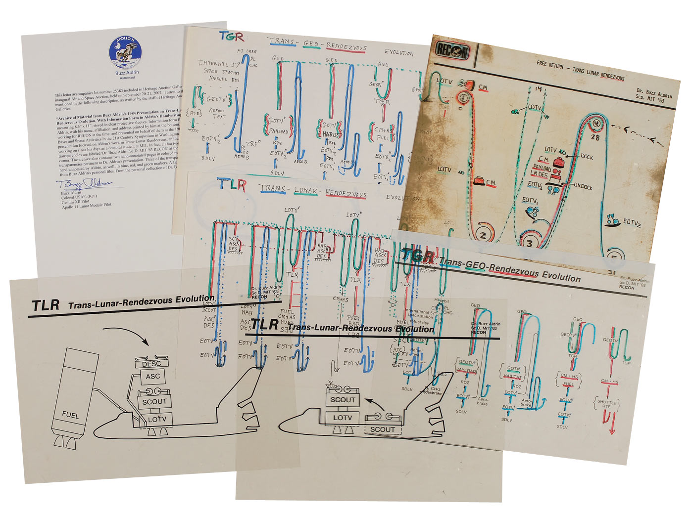 Collection of 14 transparencies from a 1984 NASA presentation on Lunar Surface Return. Measuring 8.5 x 11, these transparencies were used by Aldrin during a presentation at the Lyndon B. Johnson Space Center. The pages show mathematical models and models concerning the process of a lunar surface return, and the devices needed for such a process. In fine condition. Accompanied by a letter of provenance signed by Aldrin stating the transparencies are from his personal collection. An interesting peek inside the inner workings of a NASA project.