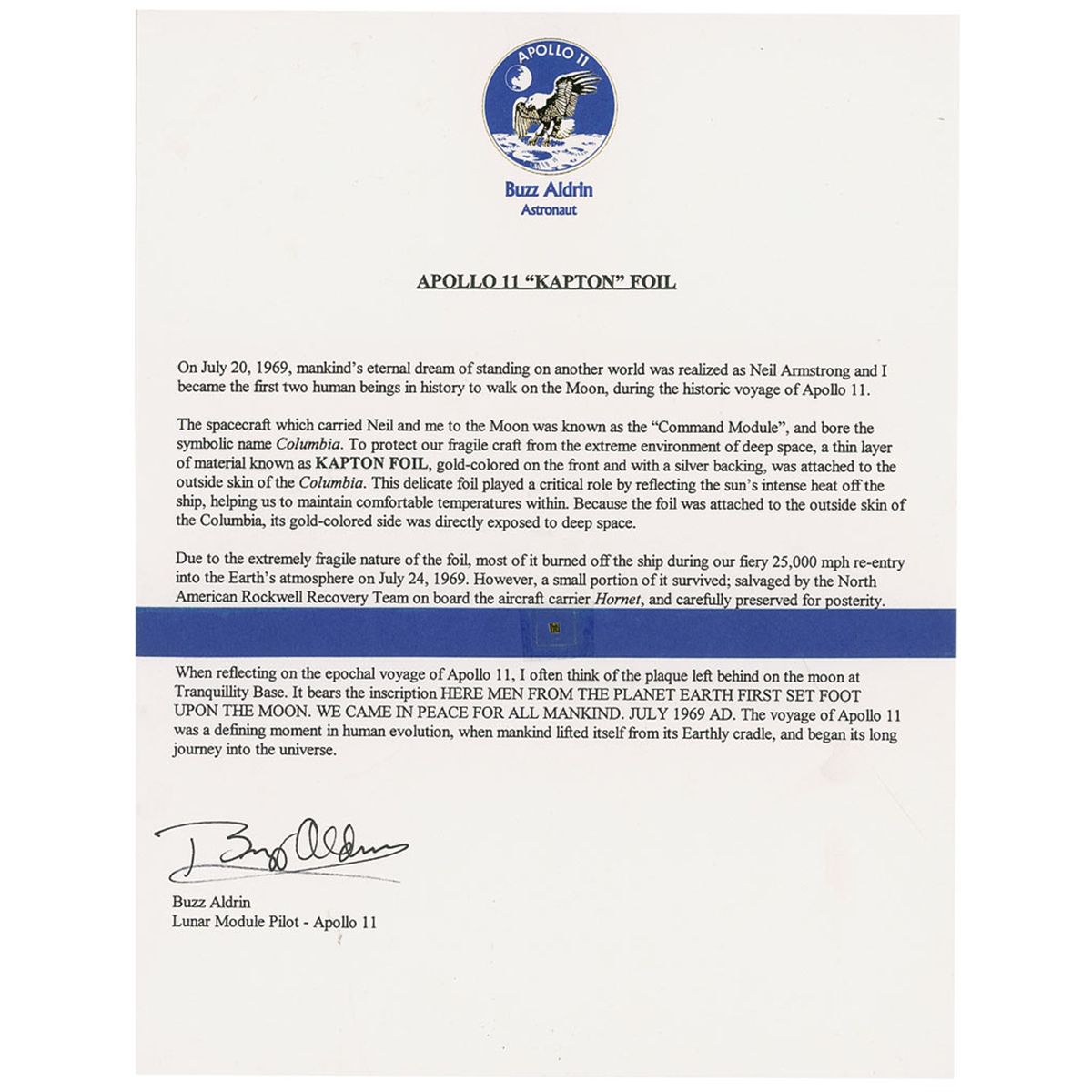 DS, one page, 8.5 x 11, no date. A flown piece of the Columbia’s Command Module gold Kapton foil. Mounted to the 11 x 8.5 sheet telling the story of the flight and a complete description of the material’s role on the spacecraft, nicely signed in black ink by Aldrin. In very fine condition.