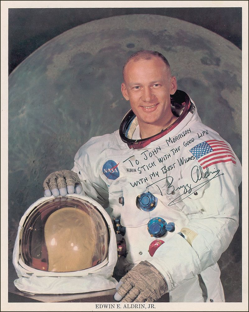Color 8 x 10 NASA photo of Aldrin in his white spacesuit before a lunar backdrop, signed and inscribed in black felt tip “To John Morrison, Stick with the good life, with my best wishes, Buzz Aldrin.” In fine condition.