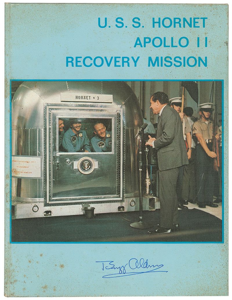 Scarce signed book: U.S.S. Hornet Apollo 11 Recovery Mission Cruisebook. Undated Taylor Publishing Company. Hardcover, 8.5 x 11.25, 64 pages. This rare book, compiled by the Hornet, is signed on the front cover in blue ballpoint by Buzz Aldrin. In very good condition, with scattered toning and foxing to covers, as well as some light wear and rubbing.