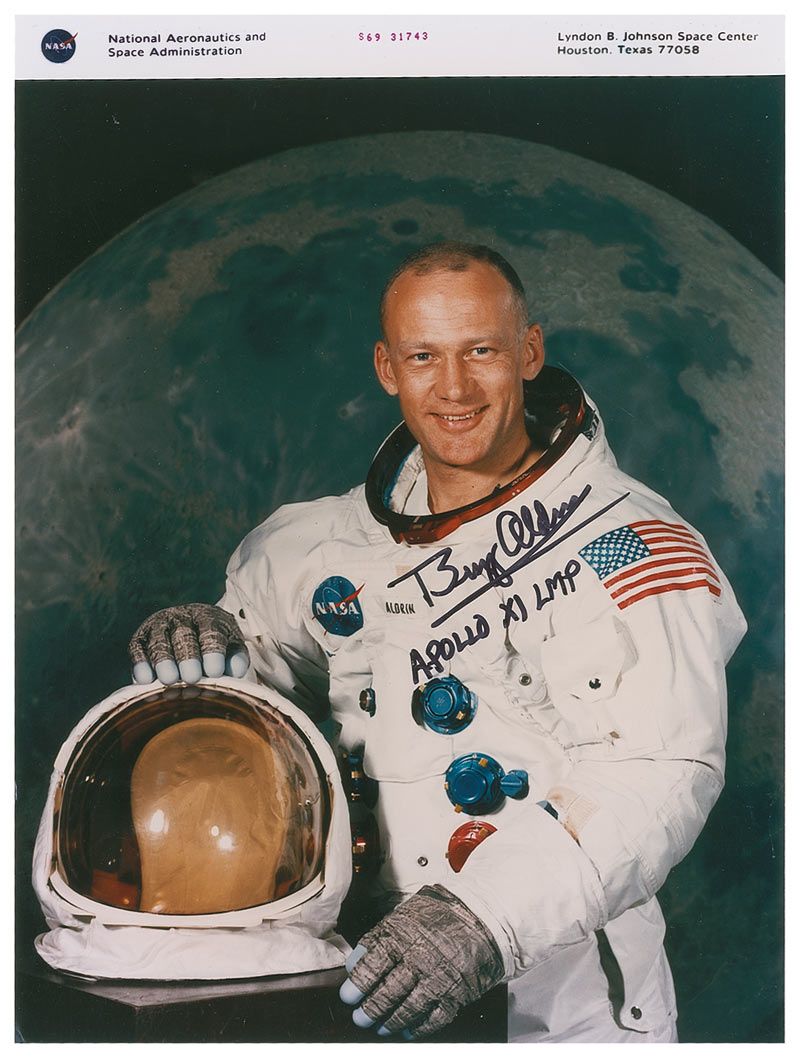 Color glossy 8 x 10 NASA photo of Aldrin posing in his white spacesuit and NASA information printed on the reverse, signed in black felt tip, “Buzz Aldrin, Apollo XI LMP.” In fine condition.
