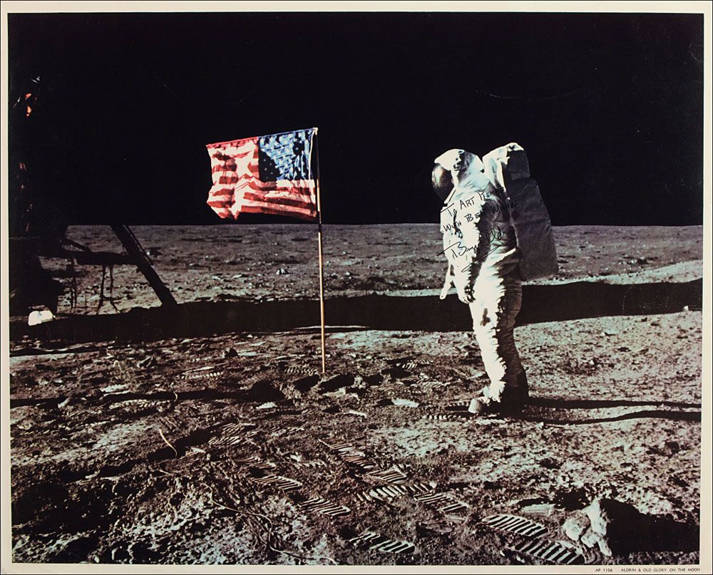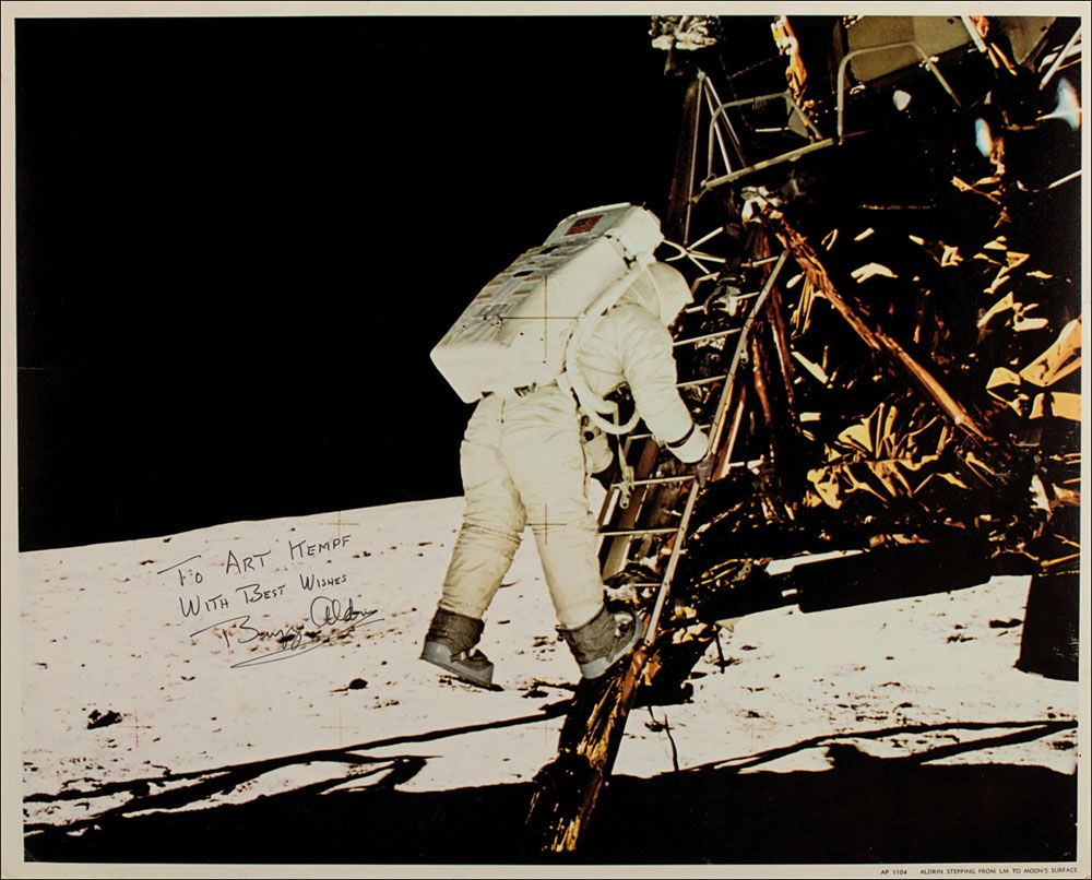 Two color cardstock 20.75 x 16.75 photos of Aldrin on the lunar surface, each signed and inscribed in black ink, “To Art Kempf with best wishes, Buzz Aldrin.” Accompanied by the original mailing envelope. A few creases and small tears, and slightly indistinct contrast to one signature, otherwise fine condition.