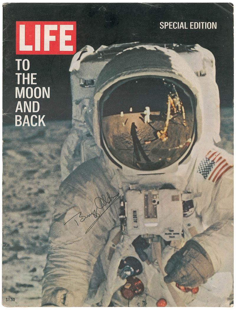 Special edition of Life magazine from 1969 commemorating the Apollo 11 moon landing, featuring an image of Aldrin on the cover, signed on the front cover in black felt tip by Aldrin, and again on the first page next to an image of his boot. Aldrin also prints his name at the beginning of the caption describing the photo, crossing out Neil Armstrong’s name. A James Spence authentication label affixed to inside of front cover, some light toning and creasing, and a musty odor, otherwise fine condition. Accompanied by a letter of authenticity from James Spence.