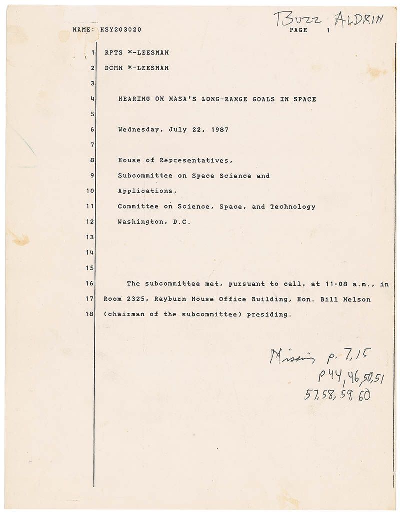 Printed transcript, approximately 80 pages (with about 10 missing pages), 8.5 x 11, of the “Hearing On NASA’s Long-Range Goal In Space,” held on July 22, 1987, signed along the top edge of the cover sheet, “Buzz Aldrin,” listing the missing pages at the bottom. A few smalls stains to cover and expected handling wear, otherwise fine condition.