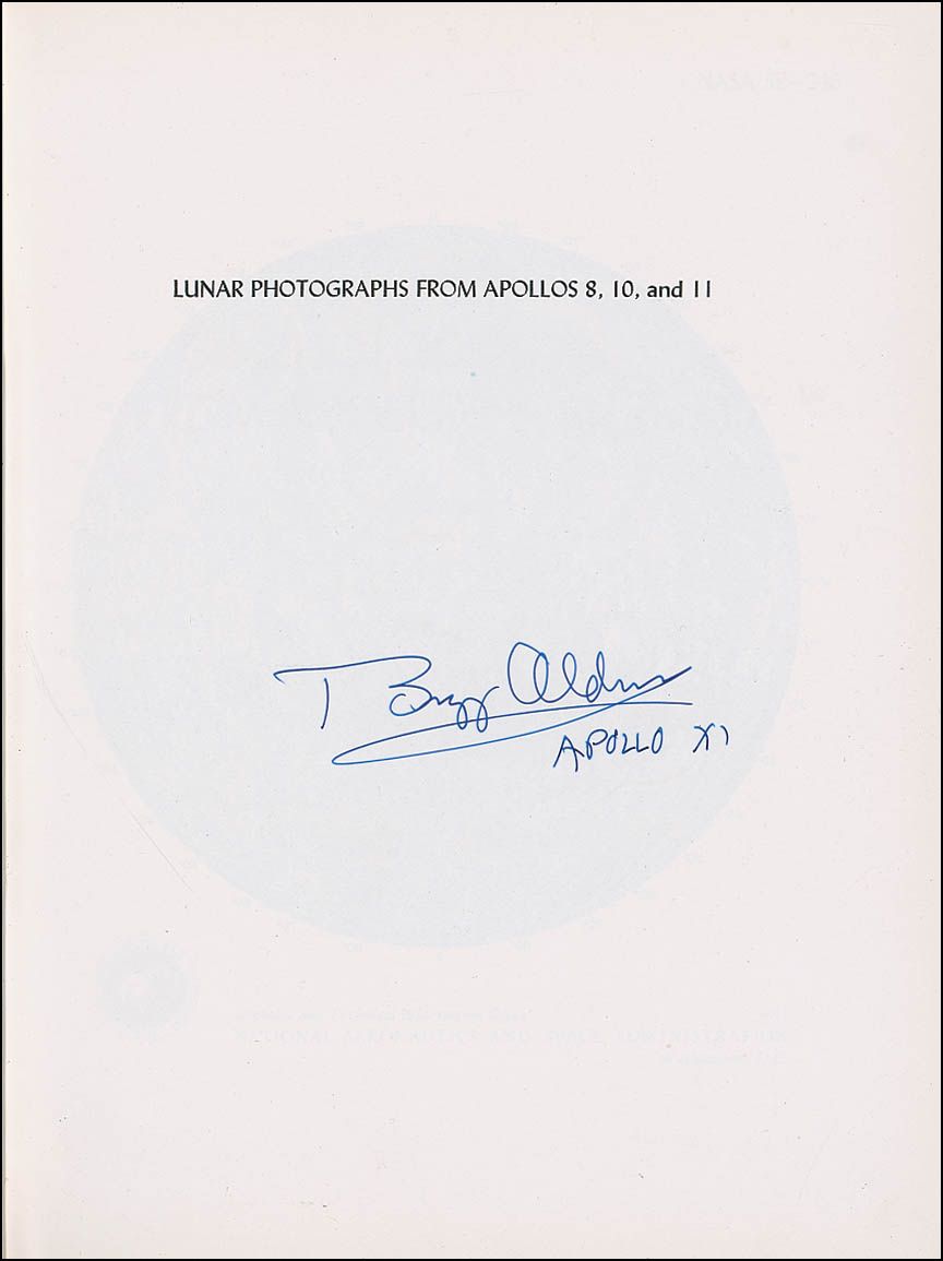 Signed book: Lunar Photographs from Apollos 8, 10, and 11. Washington, DC: NASA, 1971. Hardcover, 8 x 10.5, 119 pages. Signed on the half-title page in blue ink, “Buzz Aldrin, Apollo XI.” In fine condition, with some trivial toning.
