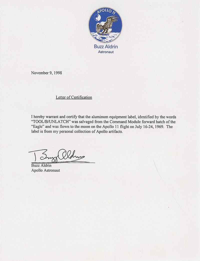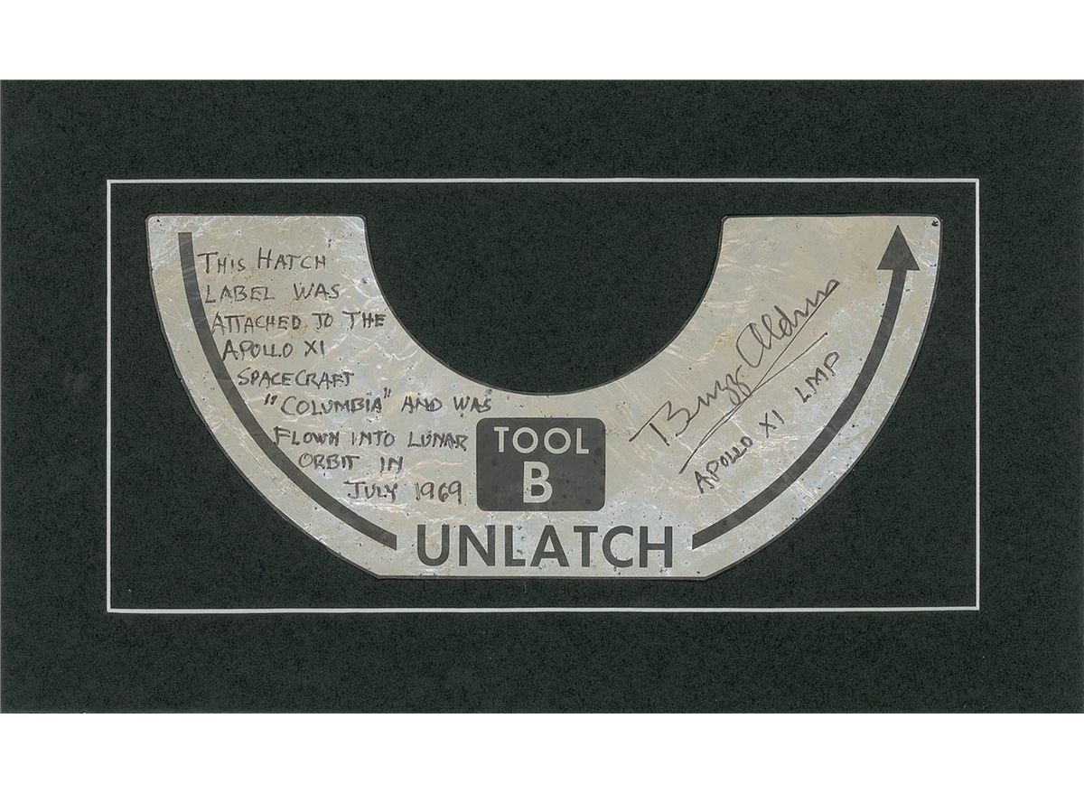 Flown U-shaped aluminum equipment label, 9 x 4, labeled “Tool B Unlatch,” with a semi-circular arrow pointing counter-clockwise, signed in black ink, “This hatch label was attached to the Apollo XI spacecraft ‘Columbia’ and was flown into lunar orbit in July 1969. Buzz Aldrin, Apollo XI LMP.” Label is affixed to a 12.25 x 7.25 black board. Accompanied by a 1998 letter of certification from Aldrin stating “I hereby warrant and certify that the aluminum equipment label, identified by the words ‘TOOL/B/UNLATCH’ was salvaged from the Command Module forward hatch of the ‘Eagle’ and was flown to the moon on the Apollo 11 flight…The label is from my personal collection of Apollo artifacts.” In fine condition, with expected toning and wrinkling to label. Accompanied by a certificate of authenticity from Novaspace. This presents an extraordinarily rare opportunity to acquire Apollo 11 flown material—with direct astronaut provenance from the second human being to set foot on the lunar surface.