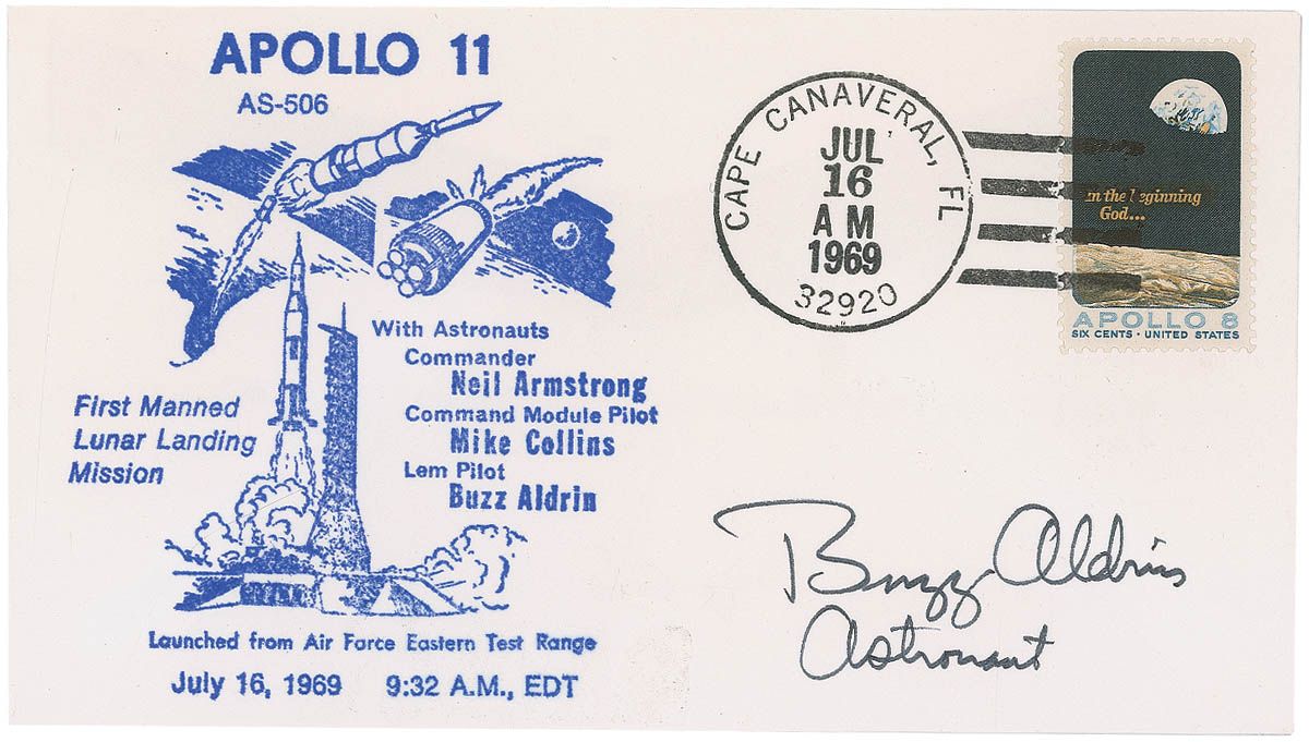 Launch day commemorative cover with a cachet honoring the lunar landing of Apollo 11, postmarked July 16, 1969, at Cape Canaveral, signed in black felt tip, “Buzz Aldrin, Astronaut.” In fine condition.
