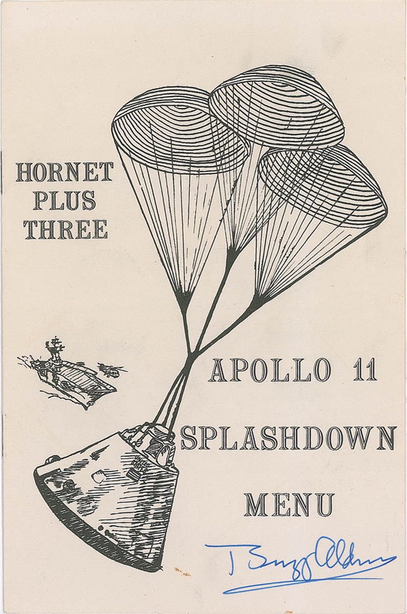 Original Hornet Plus Three Apollo 11 Splashdown Menu, 5.25 x 8, four pages, July 24, 1969, signed on the front cover in blue felt tip. Included on the menu for the “Splash Down Dinner” on the USS Hornet was a “Special Splash Down Cake.” In fine condition, with some trivial soiling.