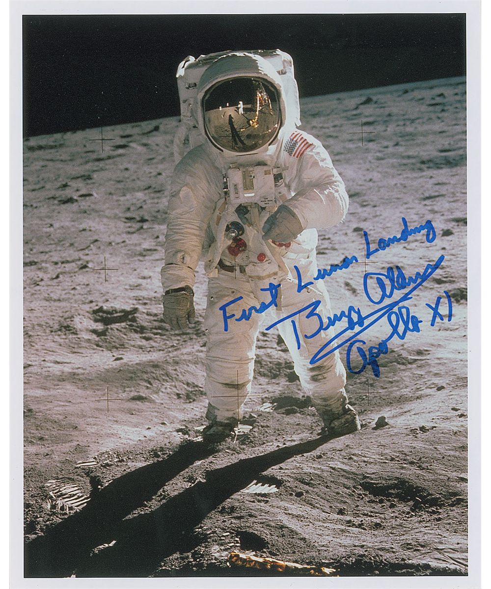 Color satin-finish 8 x 10 photo of Aldrin standing on the lunar surface, signed in blue felt tip, “First lunar landing, Buzz Aldrin, Apollo XI.” In very fine condition.