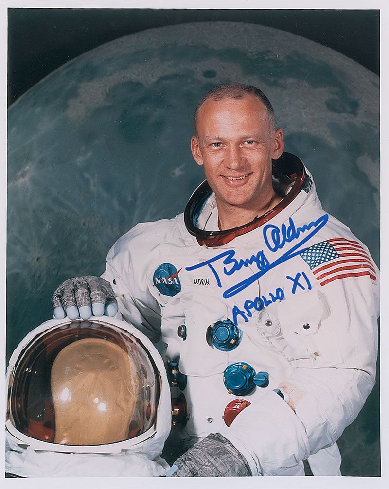 Color satin-finish 8 x 10 photo of Aldrin posing in his space suit against a lunar background, signed in blue felt tip, “Buzz Aldrin, Apollo XI.” In very fine condition.