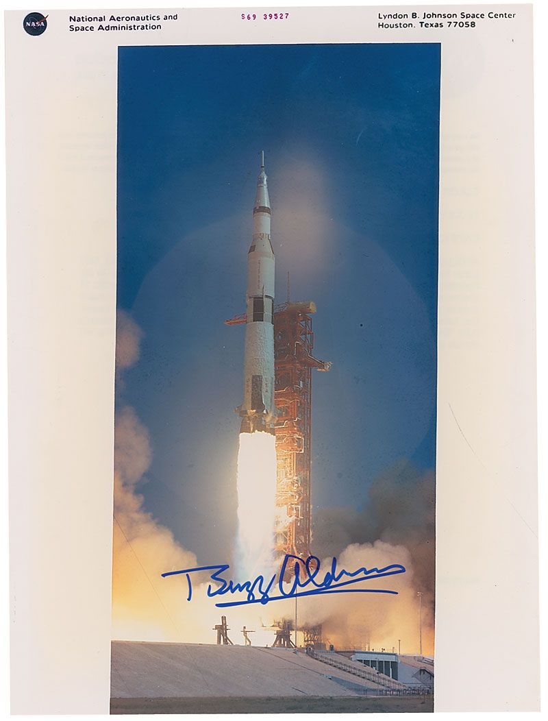 Color glossy 8 x 10.5 NASA ‘red-numbered photo of the lift-off of Apollo 11, signed in blue felt tip. In very fine condition.