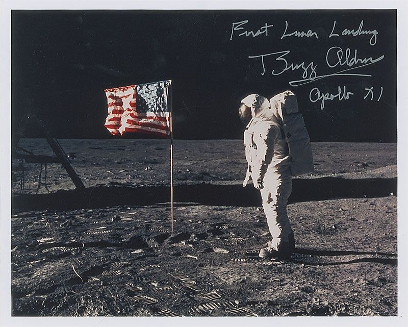 Color satin-finish 10 x 8 photo of Aldrin standing by the American flag on the moon, signed in silver ink, “First Lunar Landing, Buzz Aldrin, Apollo XI.” In very fine condition.