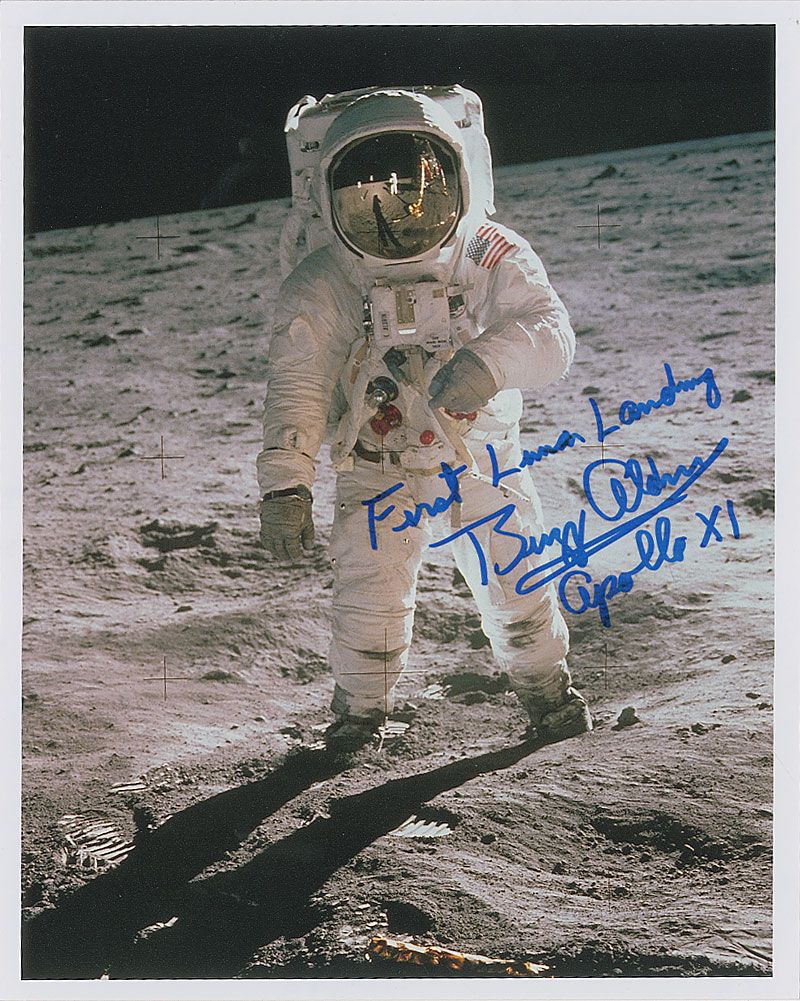 Color satin-finish 8 x 10 photo of Aldrin standing on the lunar surface, signed in blue felt tip, “First lunar landing, Buzz Aldrin, Apollo XI.” In very fine condition.