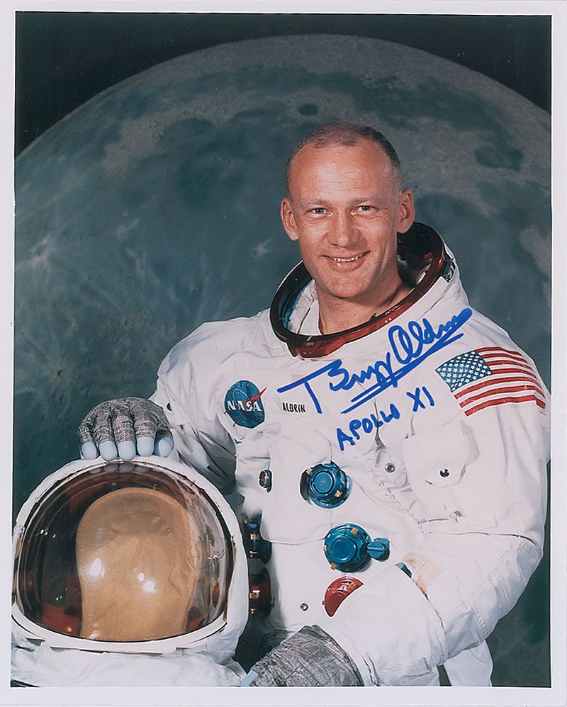 Color satin-finish 8 x 10 photo of Aldrin posing in his space suit against a lunar backdrop, signed in blue felt tip “Buzz Aldrin, Apollo XI.” In very fine condition.