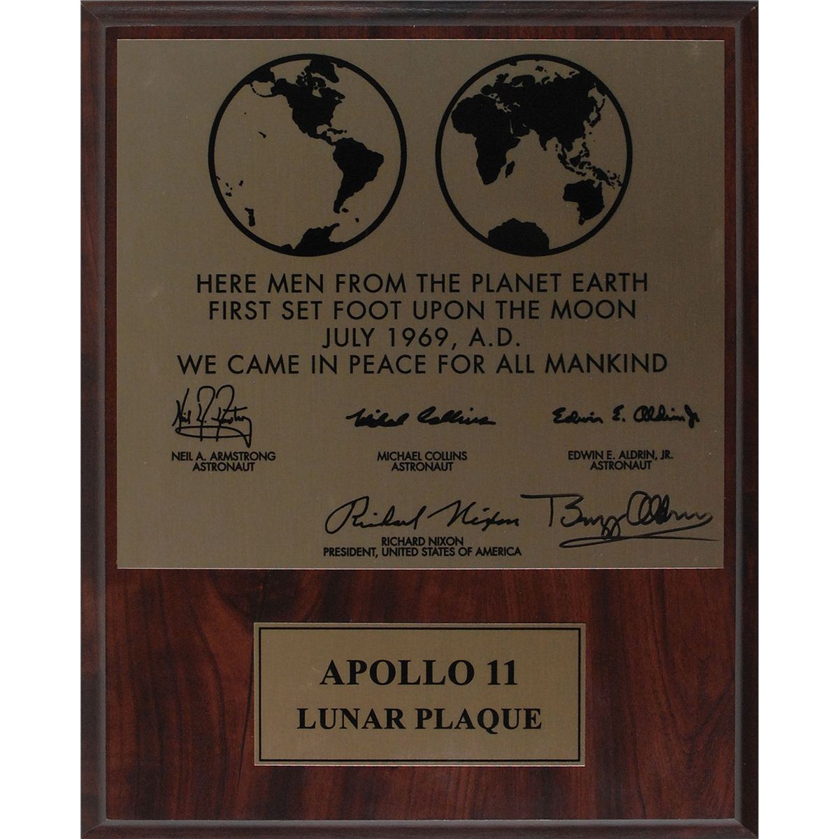 Limited edition replica 10.5 x 13 plaque, numbered 427/750, of the one left on the lunar surface by the crew of the Apollo 11 mission. The plaque reads: “Here men from the planet Earth first set foot upon the moon July 1969, A. D. We came in peace for all mankind.” The plaque carries facsimile signatures of all three crew members and of Richard Nixon, and has also been signed in black felt tip by Aldrin in the lower right corner. In very fine condition. Accompanied by a copy of a letter of authenticity from Aldrin.