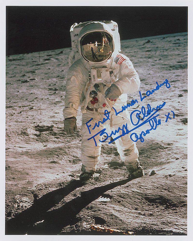 Color satin-finish 8 x 10 photo of Aldrin on the lunar surface, signed in blue felt tip, “First lunar landing, Buzz Aldrin, Apollo XI.” In very fine condition.