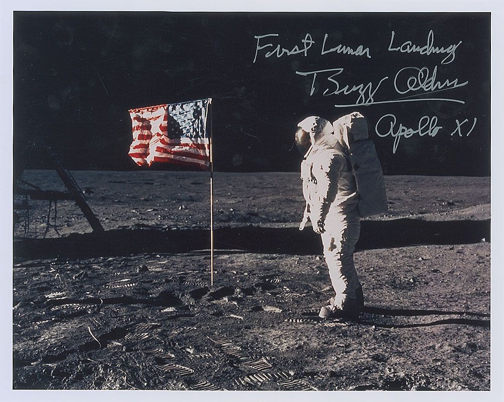 Color satin-finish 10 x 8 photo of Aldrin standing next to the American flag on the lunar surface, signed in silver ink, “First lunar landing, Buzz Aldrin, Apollo XI.” In very fine condition.