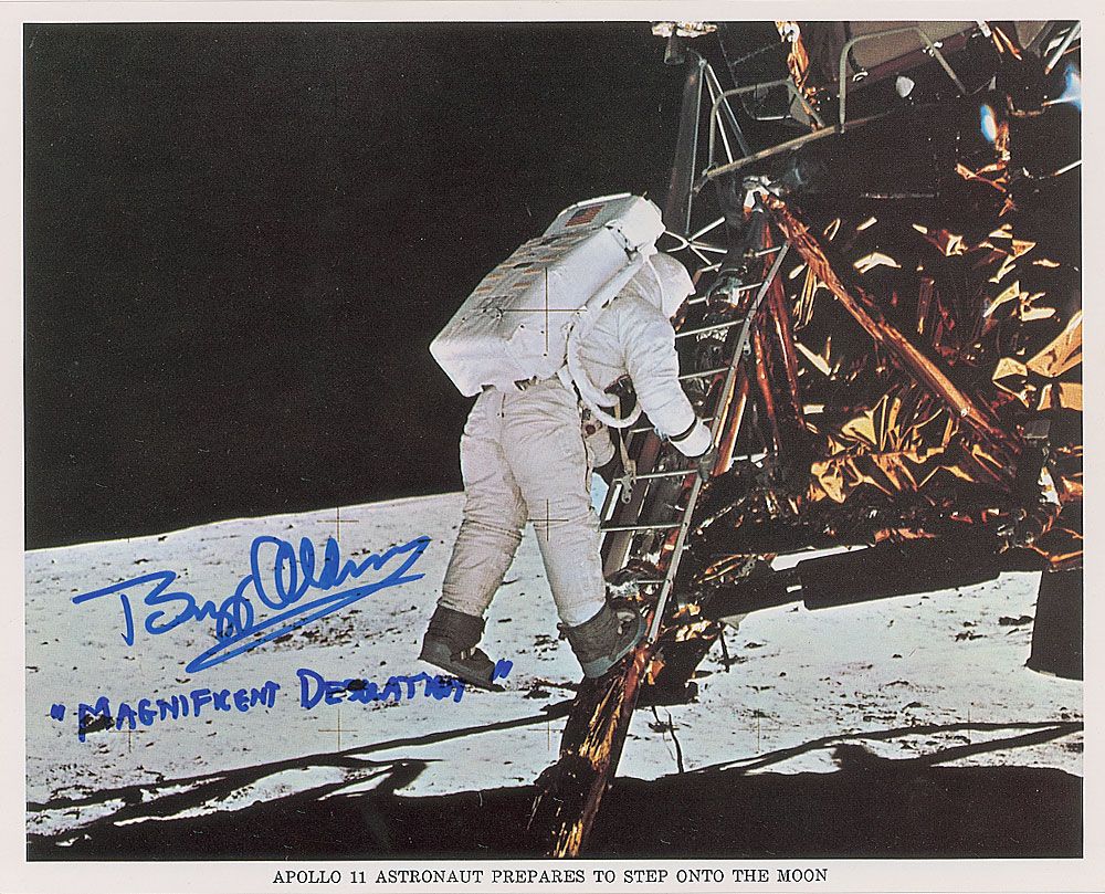 Color 10 x 8 NASA photo of Aldrin descending the LM ladder to the lunar surface, signed in blue felt tip, “Buzz Aldrin ‘Magnificent Desolation.’” In very fine condition.